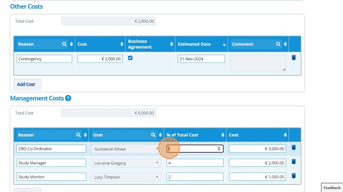 Once the percentage column is populated, the cost column will be auto calculated.