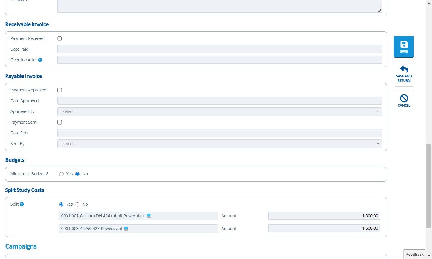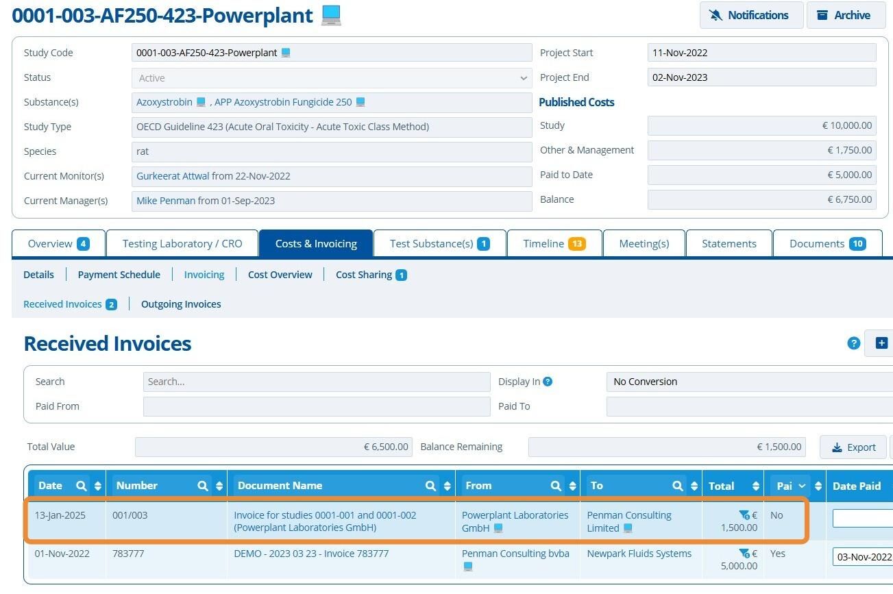 A laboratory / CRO may invoice for multiple studies in the same invoice for convenience. If this is the case, Active Steward has functionality to split the invoice costs between studies. This is useful as it means the invoice does not need to be uploaded multiple times, for each study.