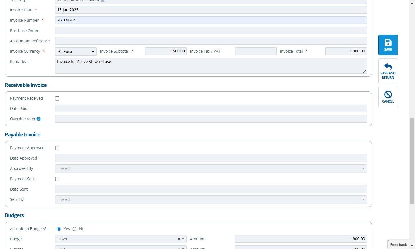 One invoice may be relevant to multiple different budgets. For example, if an invoice for the months December 2024 and January 2025 is bundled into one invoice. To create budgets, see this tutorial.