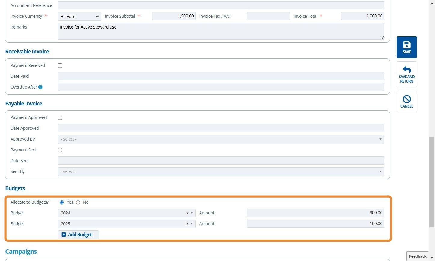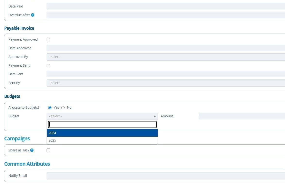 14. 👆 Click "Add Budget" 👉 select a budget from the list. Repeat this step for each budget the invoice is relevant to.¶