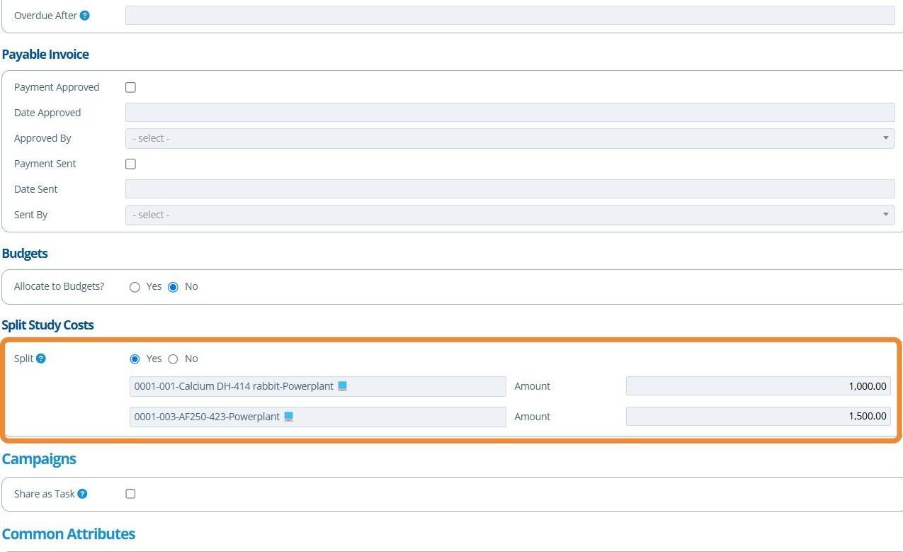 6. 👆 Scroll to find an additional invoice attribute section for "Split Study Costs".¶