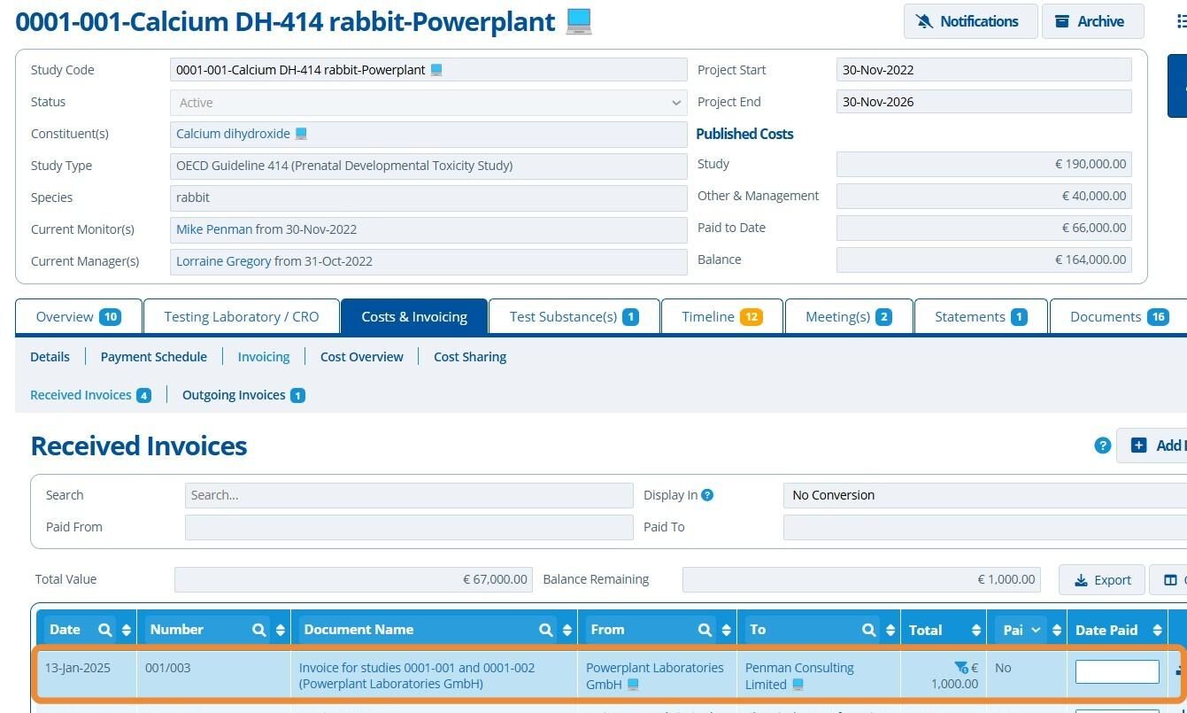 9. 🥳 See that the invoice appears on the study (001), with the relevant amount. The invoice has a "partial cost" icon to show that costs are split.¶
