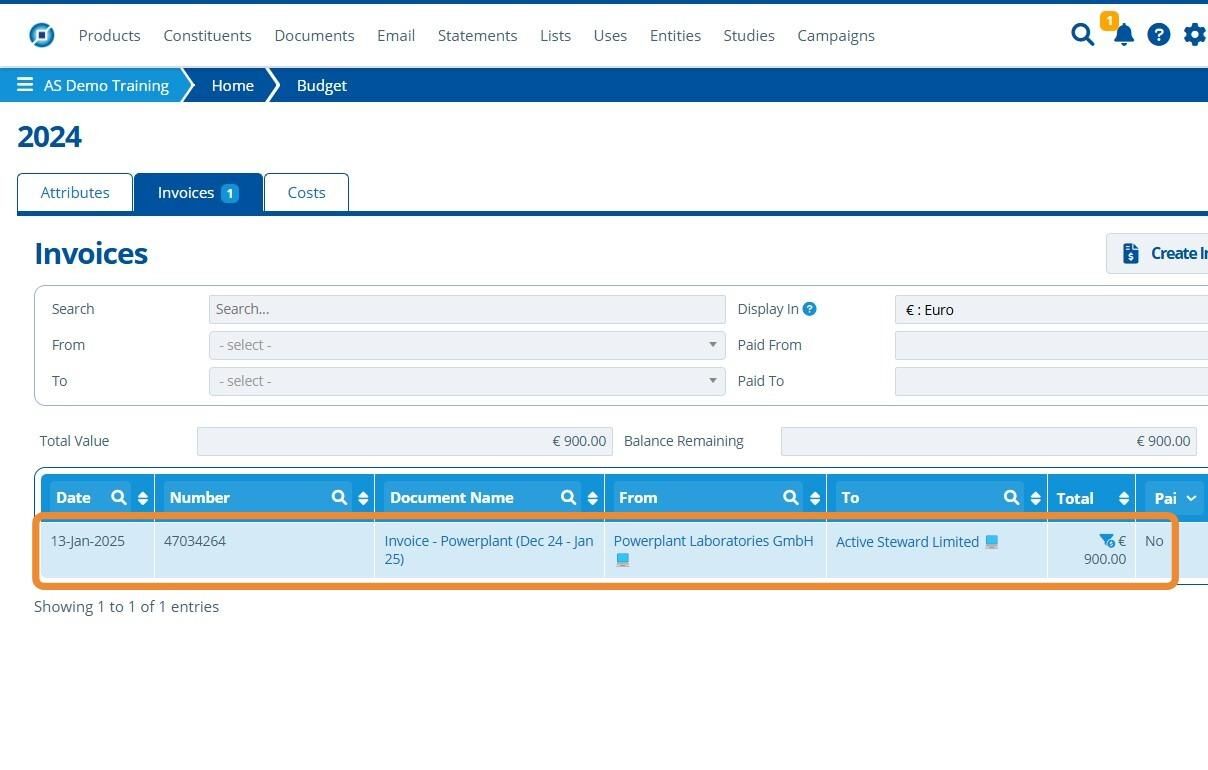 18. 🥳 See that the invoice now appears in the "Invoices" tab under the 2024 budget. The invoice has a "partial cost" icon to show that costs are split between multiple budgets.¶