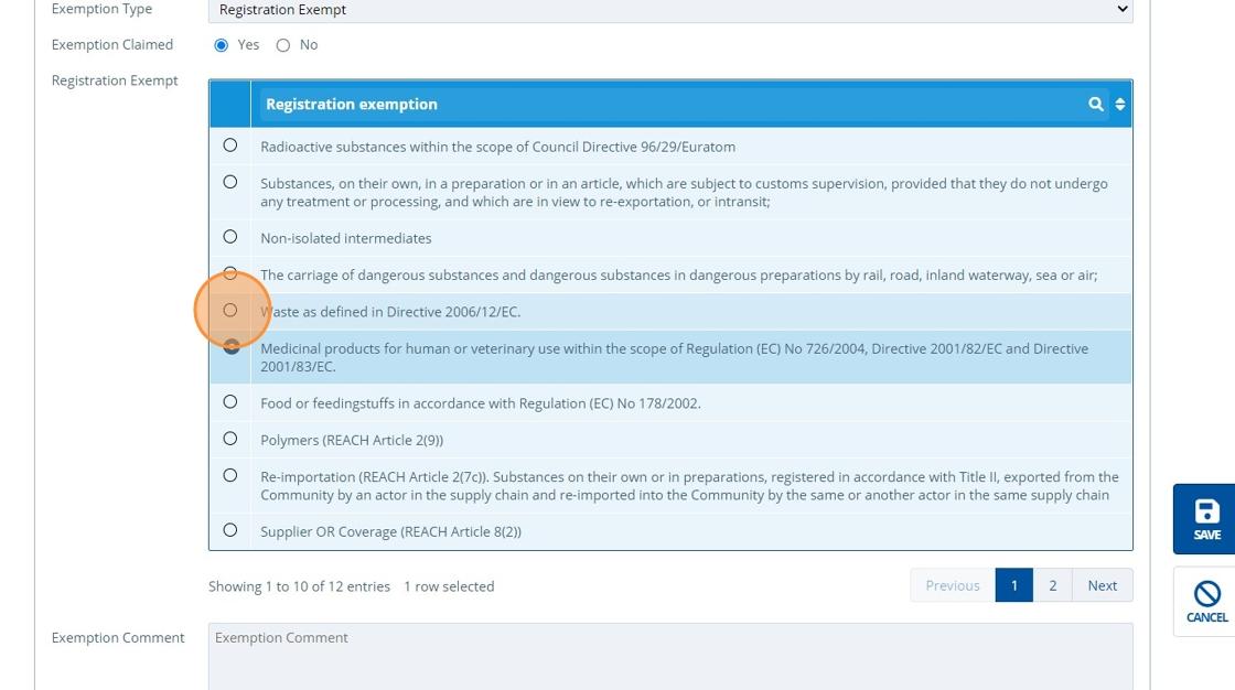 If the Exemption Type chosen is "Registration Exempt", then a list of reasons will show in the table below the "Exemption Claimed" field. The user needs to 👆 select the registration reason from the list.