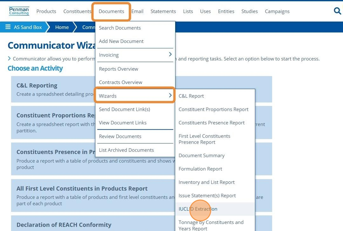3. 👆 Navigate to Documents 👉 Wizards > IUCLID Extraction.¶