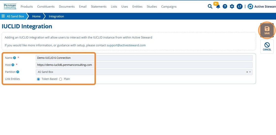 1. A prerequisite for linking to an active IUCLID file is that an integration must be set up. An integration establishes the connection between Active Steward and the IUCLID 6 software. Follow this tutorial for more help and select the "IUCLID" option from the list.¶