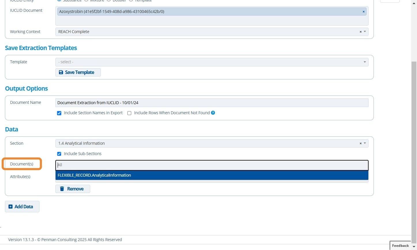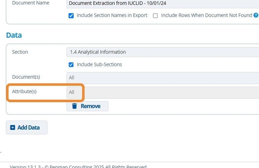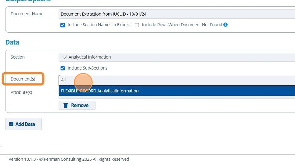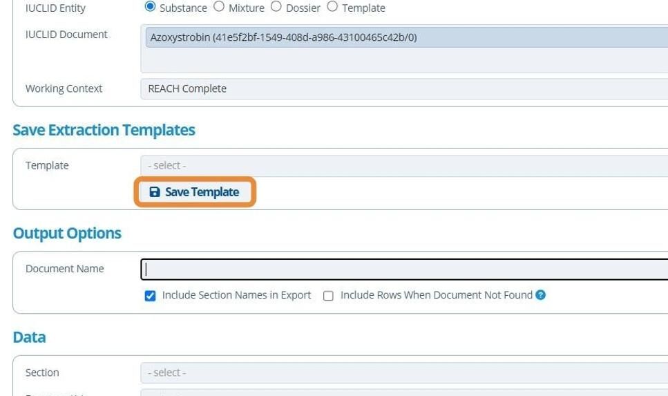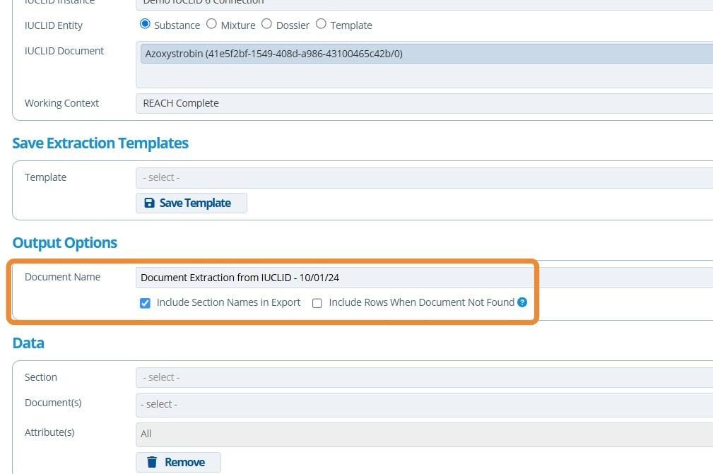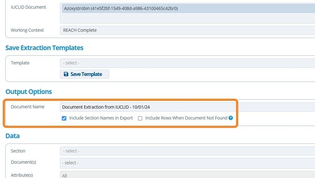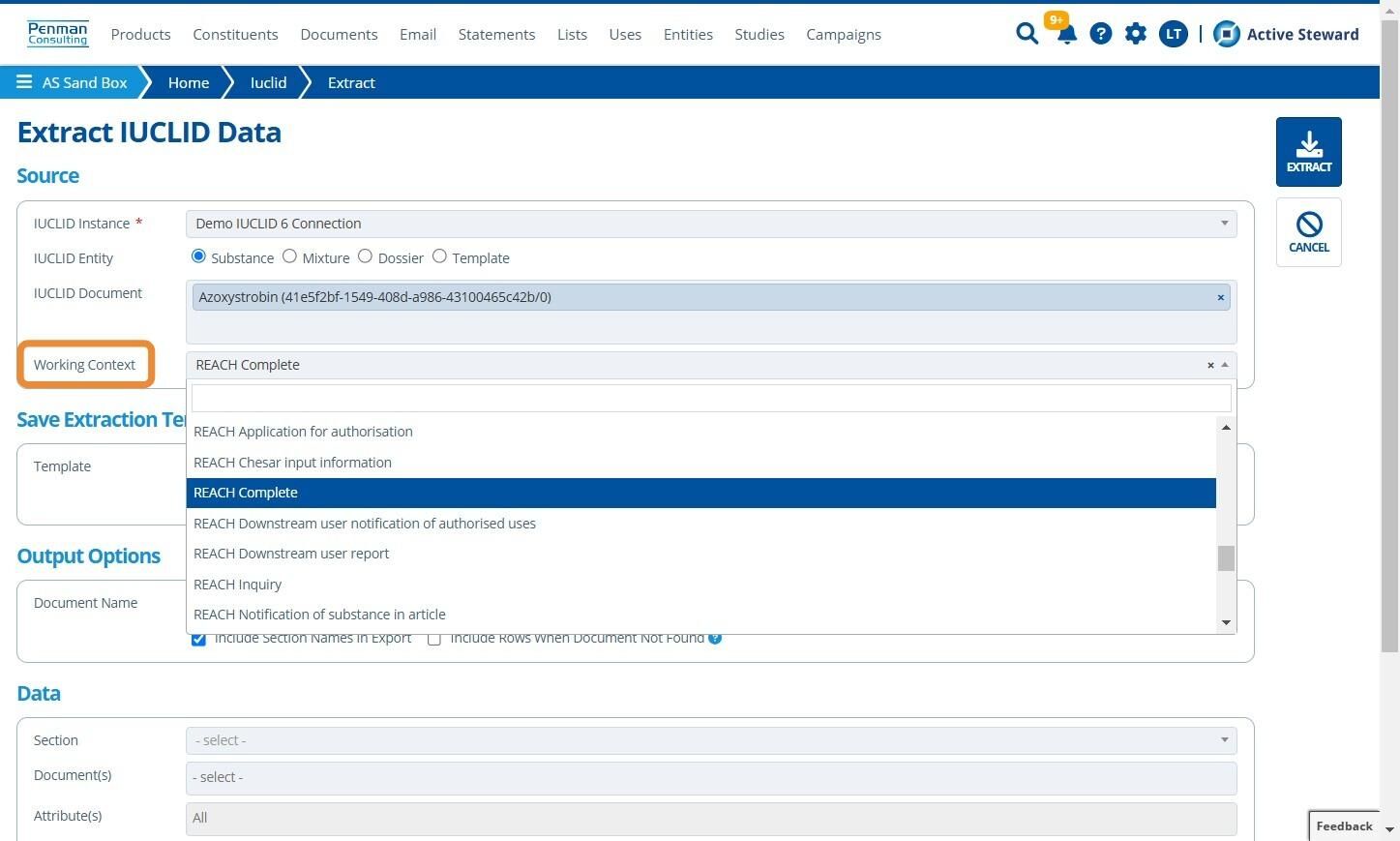 Extracting an IUCLID document is useful for collating information from multiple IUCLID records into one excel export. Working context, entities, documents, sections and attributes can be individually chosen.