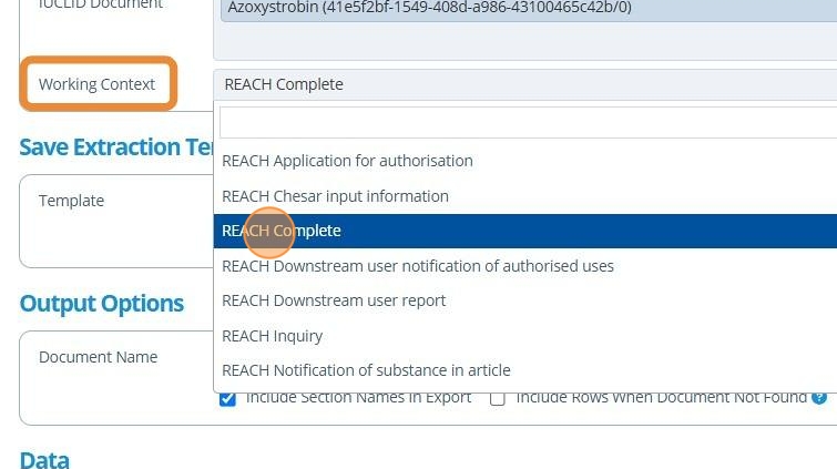 7. 👆 Optionally, Select a Working Context. This helps with selecting what IUCLID data to extract.¶